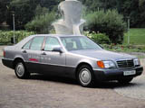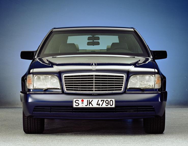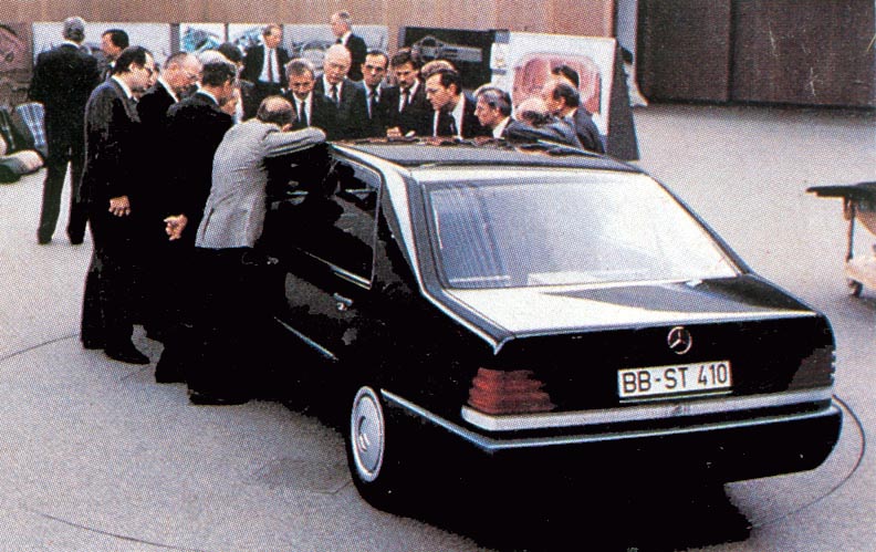 Vorbereitungen auf die "große" Modellpflege: Wohl nicht zuletzt wegen der starken Kritik im Inland wird schon in diesem Jahr die Modellpflege vorbereitet. Dieses Fotomodell trägt noch die alten Streuscheiben, 15-Loch Felgen und auch der Schriftzug am Heck entspricht -zumal zu hoch angebracht- noch der bisherigen Nomenklatur (600 SEL statt S 600). Die Bilder sind wahrscheinlich Ende '92 entstanden.