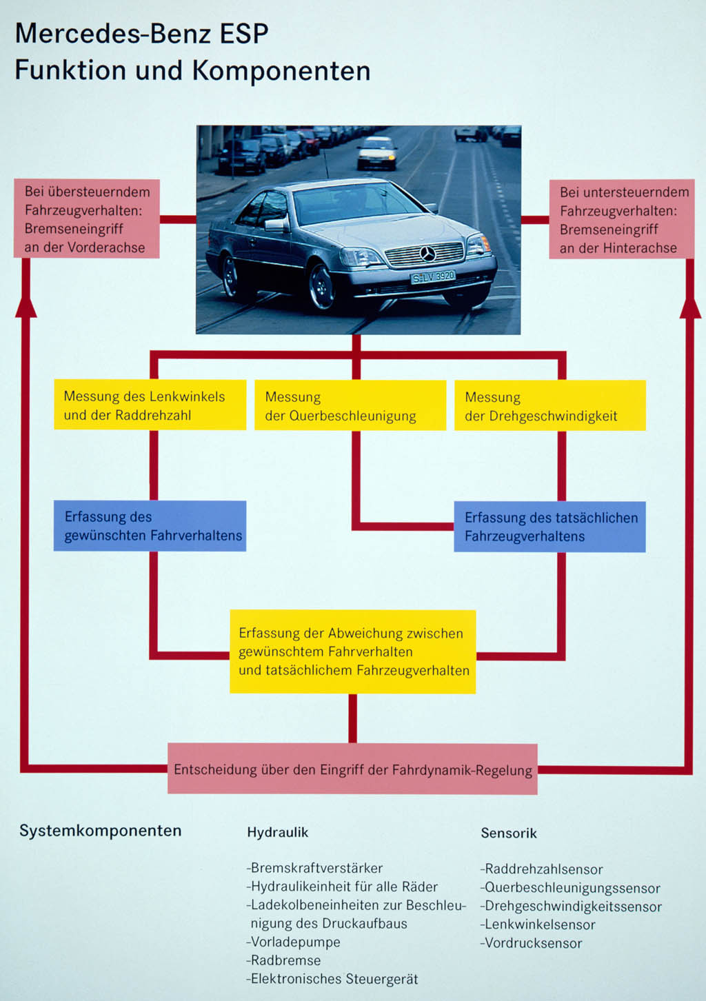 Mercedes-Benz präsentiert als Weltneuheit den Bremsassistenten, eine Innovation, die der aktiven Sicherheit dient. BAS ist in der Lage, Notbremsungen zu erkennen und bei Bedarf automatisch und in kürzerer Zeit als bisher die maximale Bremskraftunterstützung aufzubauen. Der Bremsweg des Fahrzeugs wird dadurch entscheidend verkürzt. |