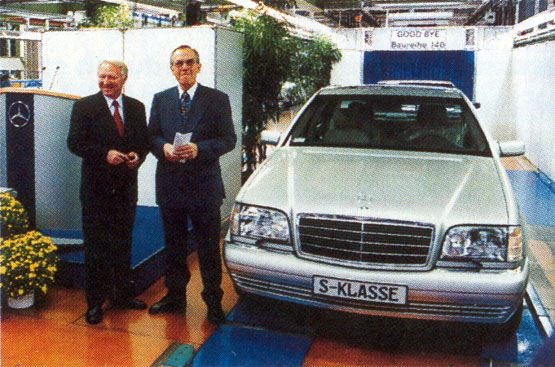 Anlauf der Pilotserie - seit 1976 gibt es in Sindelfingen das 'Pilotwerk', das man sich wie ein Miniatur-Montageband vorstellen kann. Es ermöglicht, die Fertigung unter serienmäßigen Bedingungen abseits der laufenden Produktion zu erproben und zu optimieren. Rund 2800 Mitarbeiter werden hier am W140 geschult. Das Pilotwerk erleichtert den Serienanlauf und garantiert vom ersten Auto an optimale Qualität. Komplexe Arbeitsvorgänge werden so lange trainiert, bis jeder Handgriff sitzt. Hier entstehen quasi in Handarbeit auch die Pressefahrzeuge für die Fahrpräsentation in Südfrankreich. |